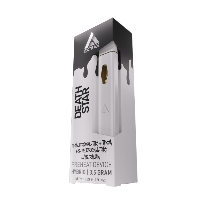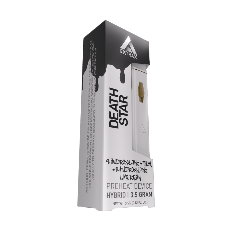We use a blend of 9-Hydroxy-THC (HXY9-THC) + 8-Hydroxy-THC (HXY8-THC) + THCM + Live Resin. The device has a pre-heat button filled with approximately 3.5 grams of Hemp-derived cannabinoid blend.