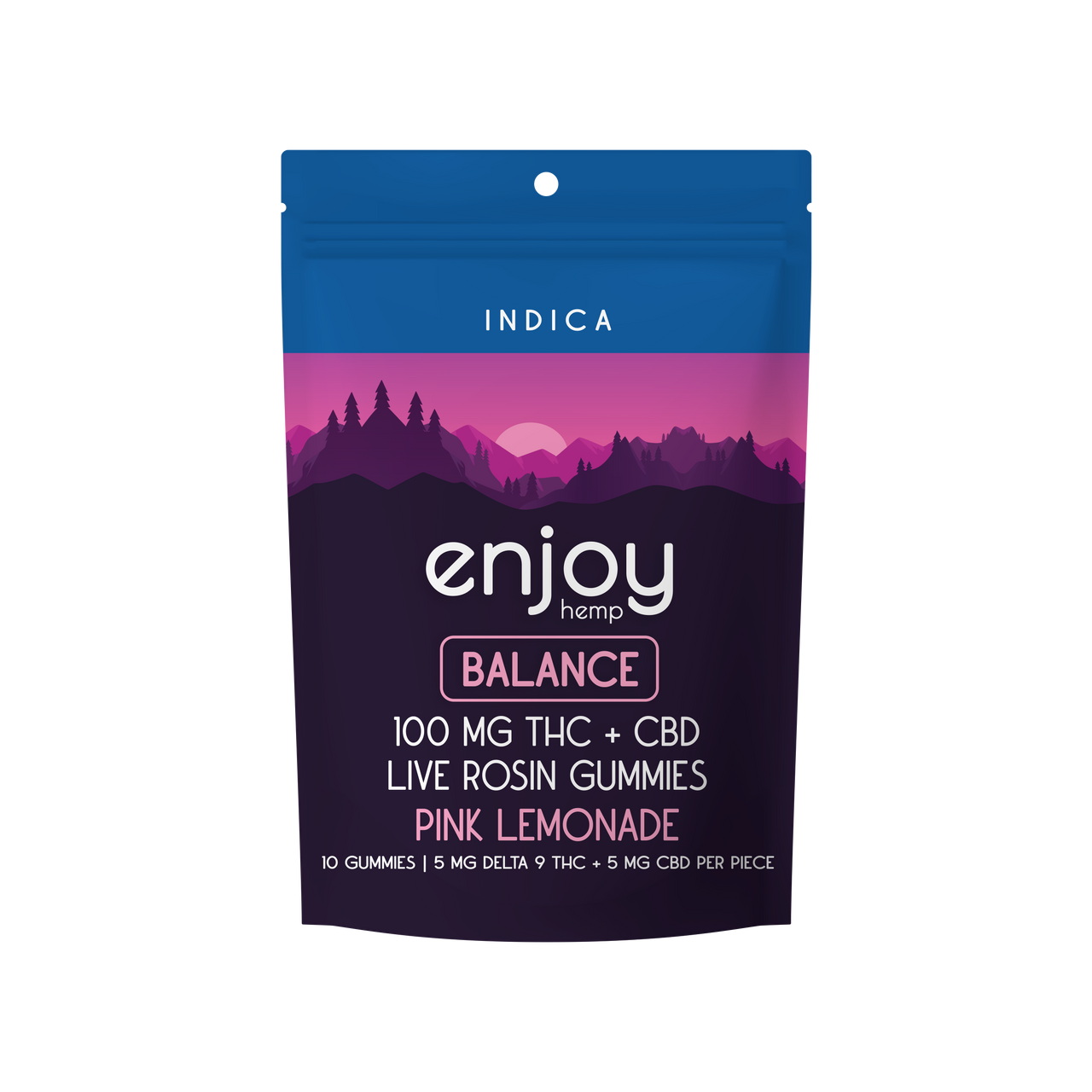 Enjoy Hemp Live Rosin Microdose THC:CBD 1:1 100mg Gummies for Balance (Indica-Infused Pink Lemonade) - 10 mg each (5 mg Delta 9 THC + 5 mg of CBD) | 10 gummies